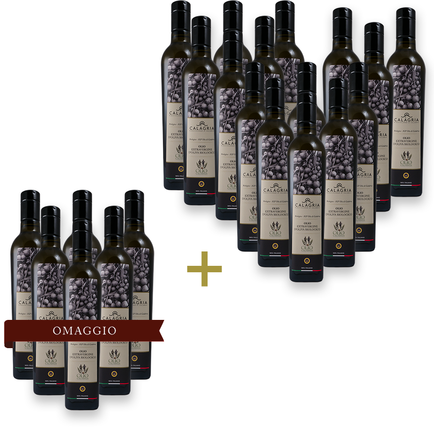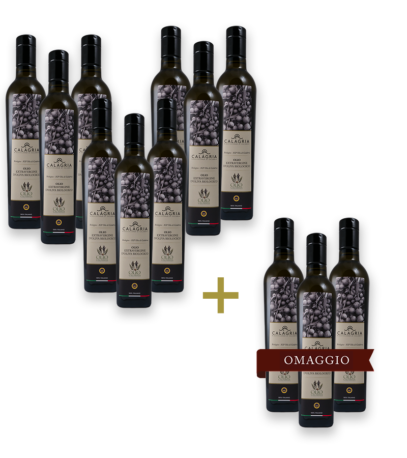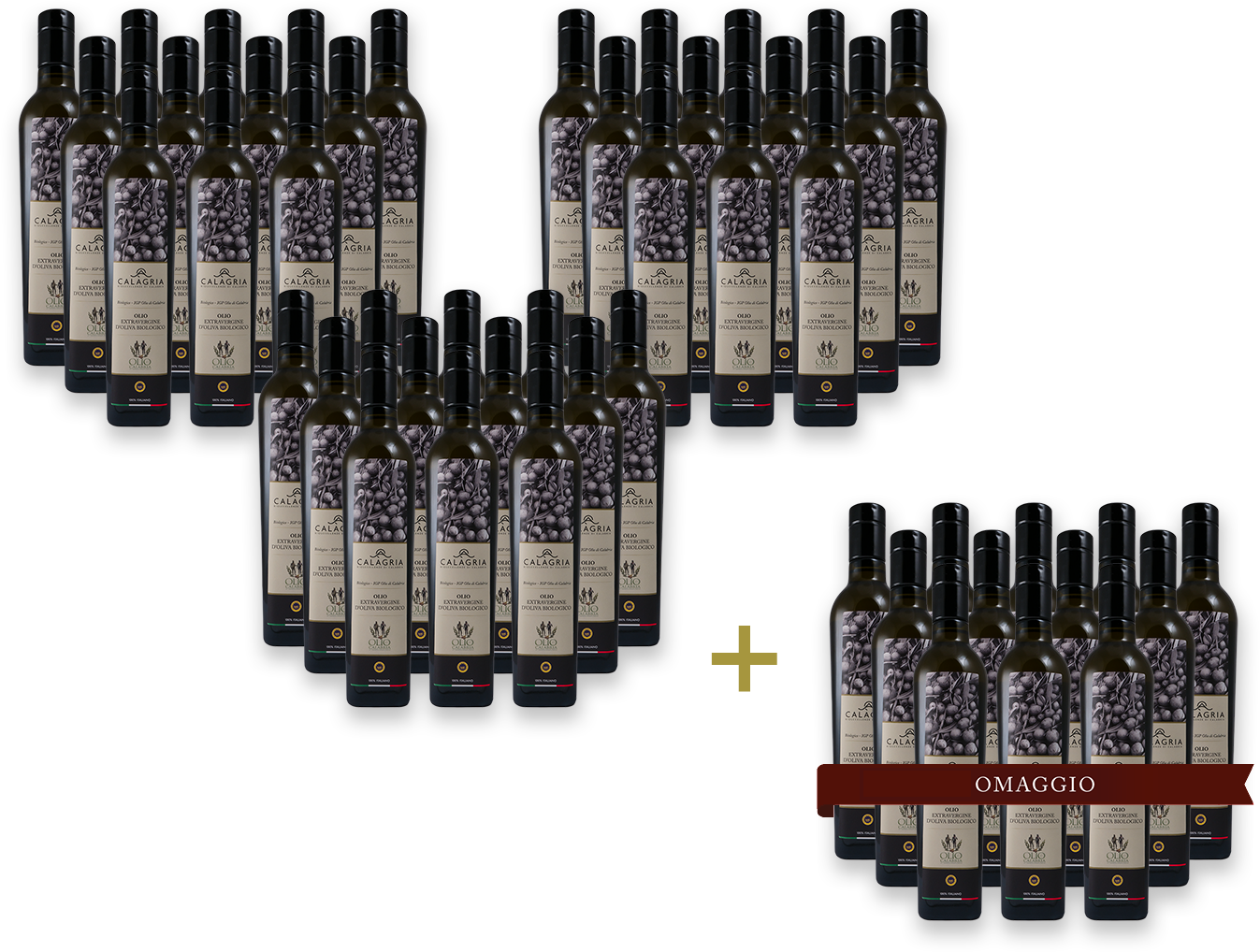 Aggiungi a carrello 4 confezioni del nostro olio (ogni confezione è composta da 3, 6 o 12 bottiglie da 500 ml), e la 4 confezione sarà in omaggio.